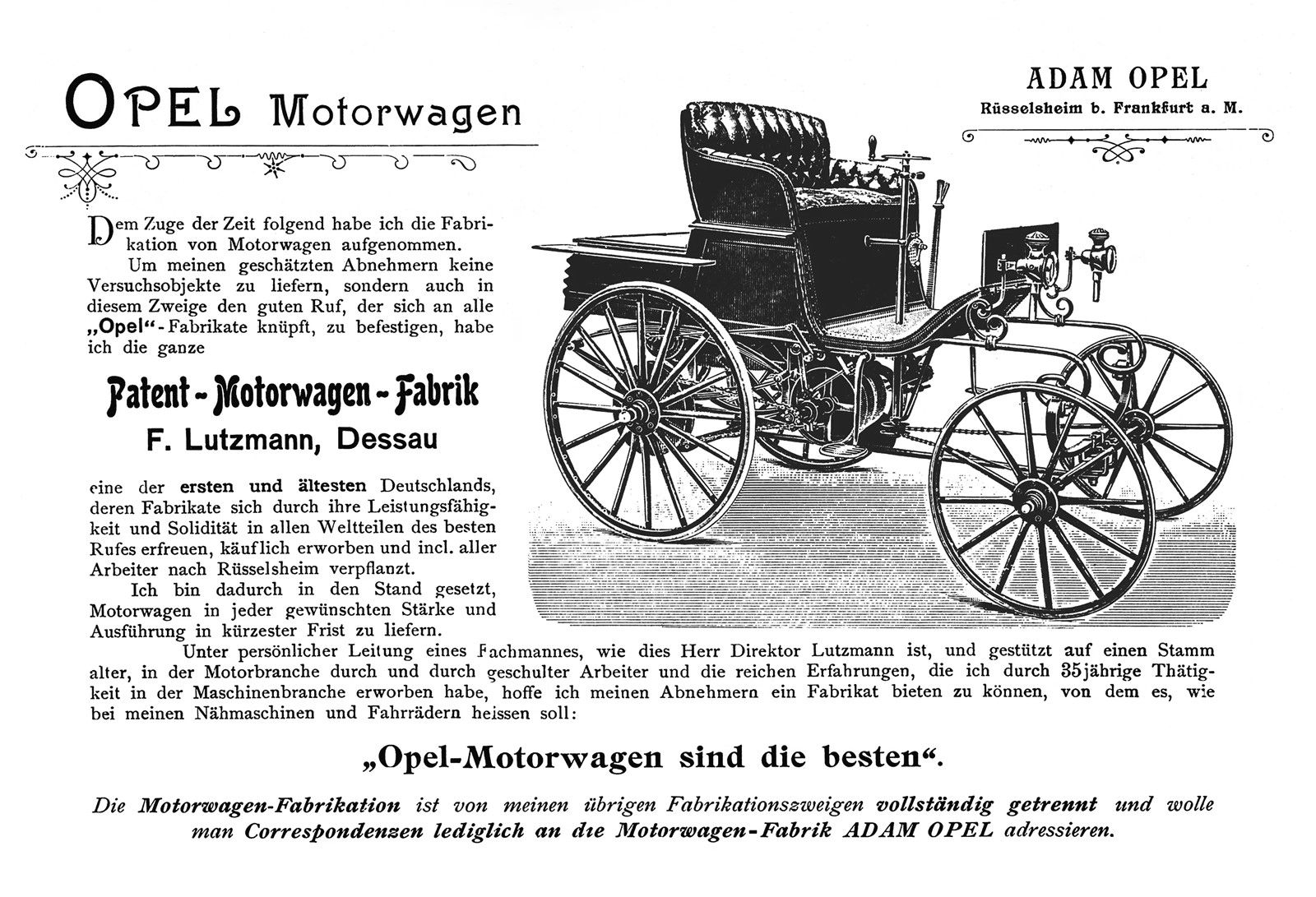 To oni również dokonali fundamentalnej zmiany idącej w kierunku zmotoryzowanego transportu firmy Opel. Ze względu na kryzys w branży rowerowej w latach 90-tych XIX wieku, bracia Opel poszukiwali nowych produktów i wpadli na pomysł samochodu. W 1897 roku Fritz i Wilhelm Opel odwiedzili pierwszy Niemiecki Salon Samochodowy w Berlinie i spotkali tam Friedricha Lutzmanna. Mistrz ślusarski produkował samochody od 1894 roku, a zatem miał doświadczenie, którego potrzebowali bracia Opel. Zaprosił on braci Opel do swojej fabryki w Dessau, gdzie Fritz i Wilhelm natychmiast dostrzegli potencjał związany z produkcją samochodów, który zaprezentował im Lutzmann.