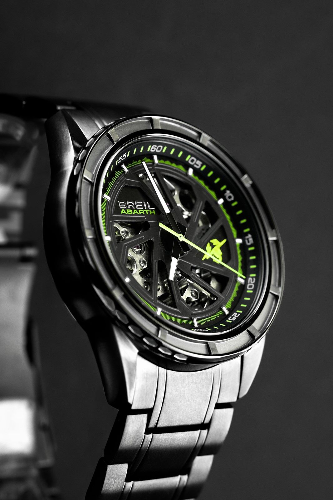 Dzięki dopracowanym detalom, zegarek inspirowany Abarthem 500e nawiązuje do najbardziej kultowych elementów nowego, elektrycznego modelu Abartha. Zegarek umiejętnie łączy technologię, styl i osiągi, podobnie jak samochód. Dzięki przyciągającym wzrok detalom, szkieletowa konstrukcja z tytanowym wykończeniem stanowi hołd dla felg aluminiowych Abartha 500e i pozwala na wgląd w mechanizm znajdujący się wewnątrz zegarka: automatyczny Seiko NH70. Zegarek jest również ozdobiony detalami w zachwycającym kolorze „Acid green”, użytymi do podkreślenia wskazówek sekundowych i wskaźników na tarczy zegarka. Ponadto, wzór reflektorów można rozpoznać w obudowie ze stali tytanowej IP odzwierciedlającej pewny siebie wygląd samochodu, którego sportowy, charakterystyczny, wyczynowy i odważny styl można poczuć po prostu na niego patrząc.