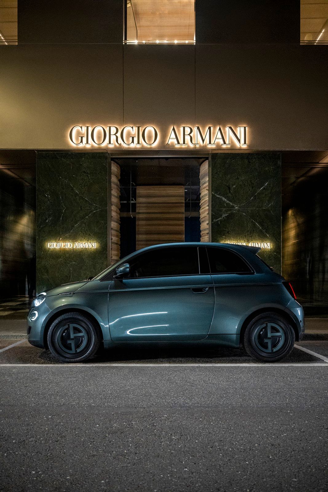 Wnętrze 500e Giorgio Armani Collector's Edition jest przykładem kunsztu rzemieślniczego, podkreślonego przez szewronowe przeszycia i trójwymiarowe wzory na środkowych wstawkach foteli, nawiązujące do tradycyjnych technik krawieckich. Materiały łączą w sobie nowoczesne technologie z rzemieślniczą precyzją. Wstawka w desce rozdzielczej, wykonana z laserowo ciętego drewna, oferuje luksusową miękkość. Detale, takie jak misterne hafty i logotyp Giorgio Armaniego, umieszczone na kołach, fotelach, desce rozdzielczej, progach drzwi i tylnej szybie, podkreślają prestiżowy charakter współpracy.