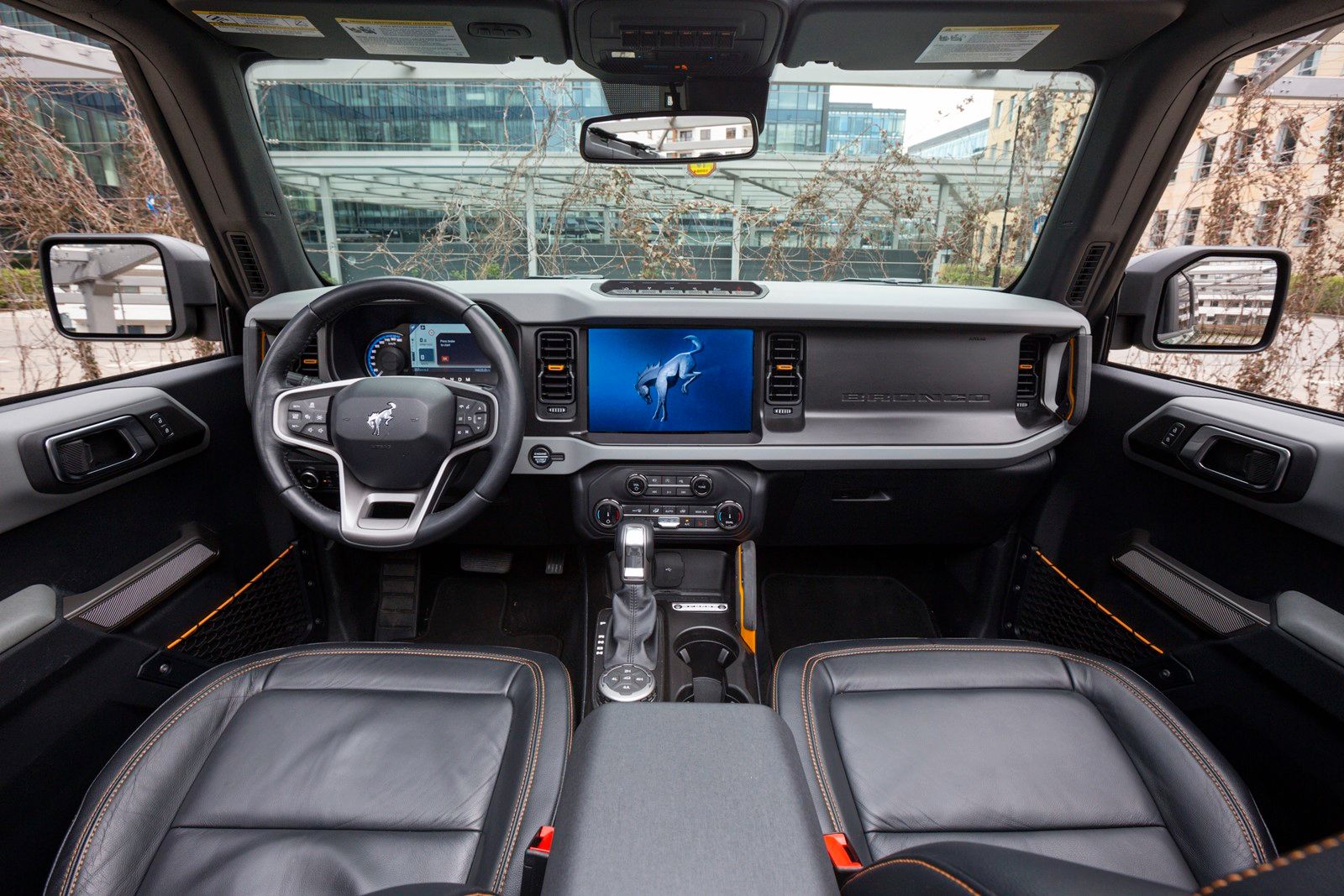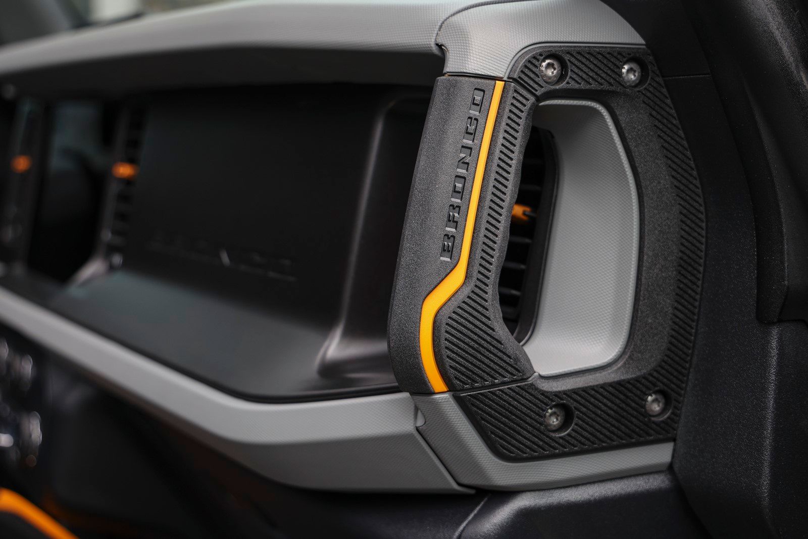 Podobnie jest z samym napisem „Bronco”. Przede wszystkim można go znaleźć na froncie auta – podobnie jak u swojego protoplasty, a także między innymi na dole przedniej szyby, na uchwytach przy desce rozdzielczej, a także na wielu śrubach.