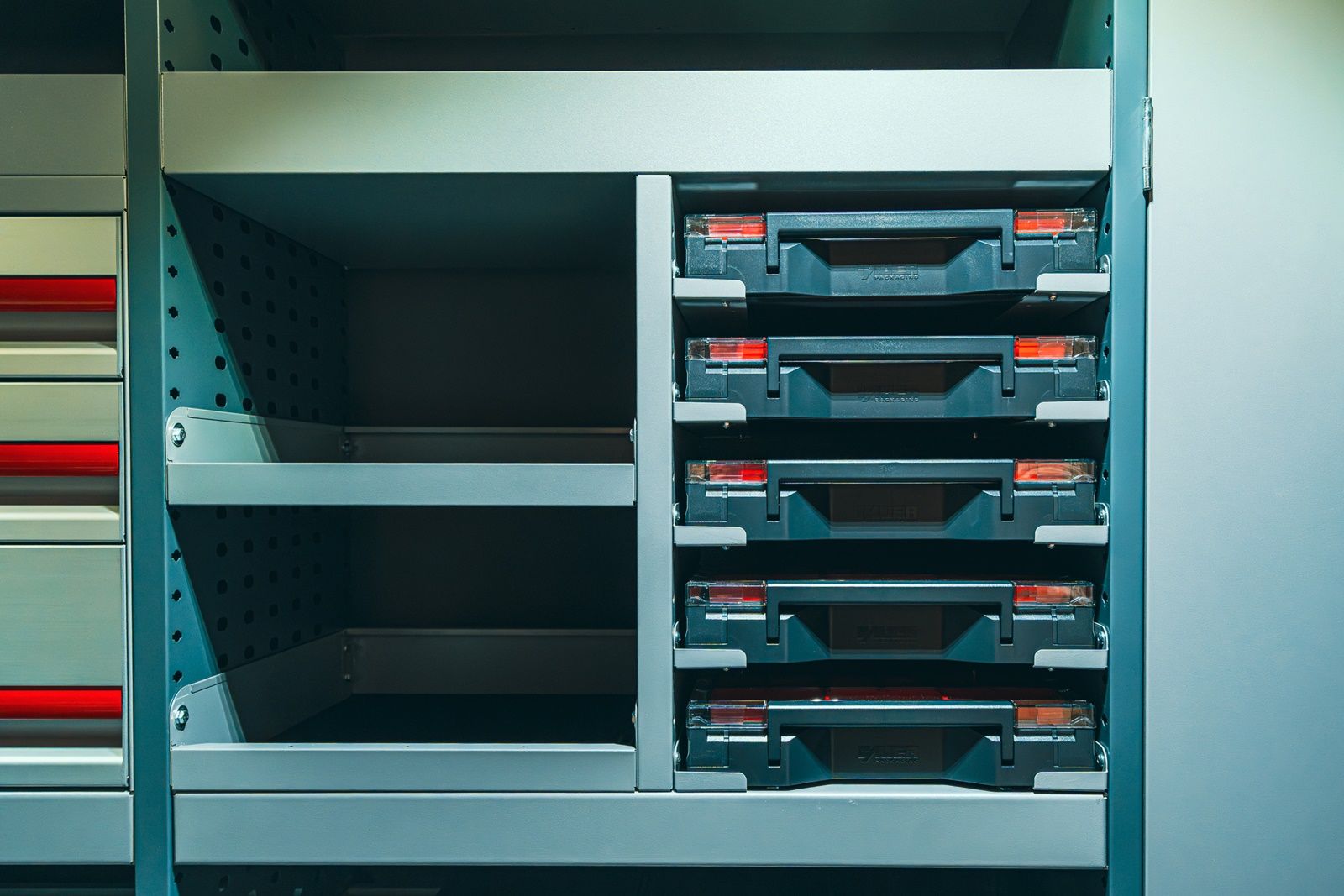 Na liście opcji znaleźć można również pudełka asortymentowe, idealne do przechowywania mniejszych elementów wyposażenia roboczego oraz pojemniki warsztatowe, przegródki na półkę, a także uchwyty i haczyki.