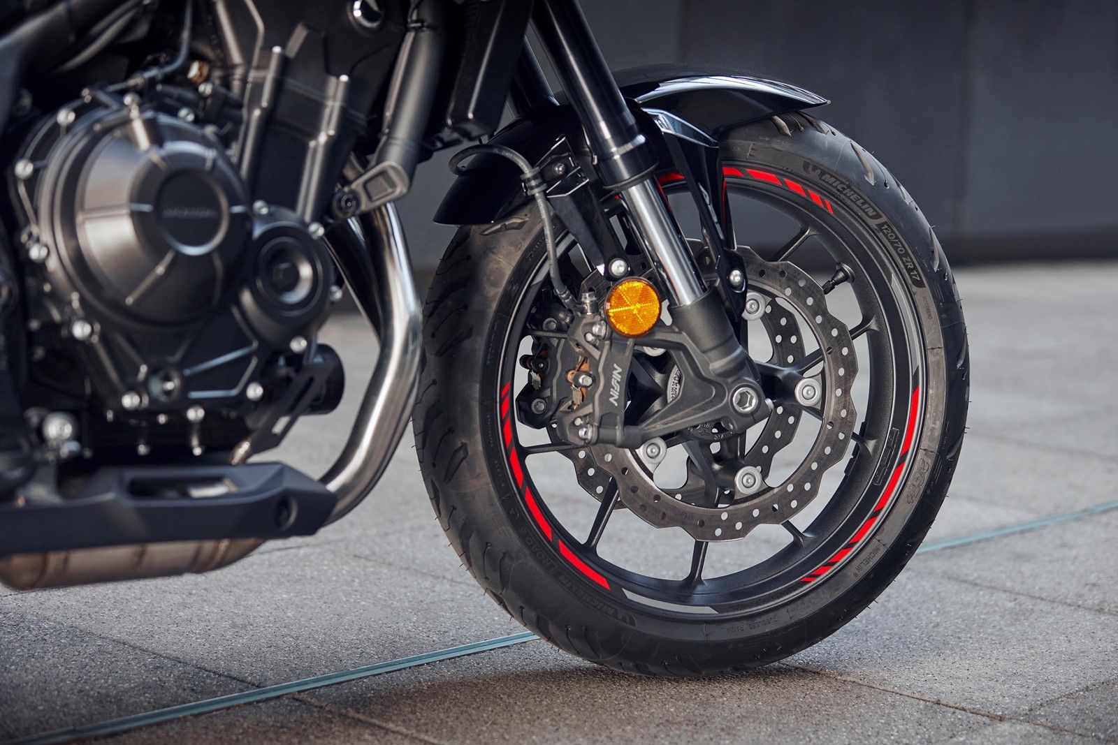 Podwójne tarcze 296 mm x 4 mm hamowane przez czterotłoczkowe zaciski Nissin z radialnym mocowaniem |
