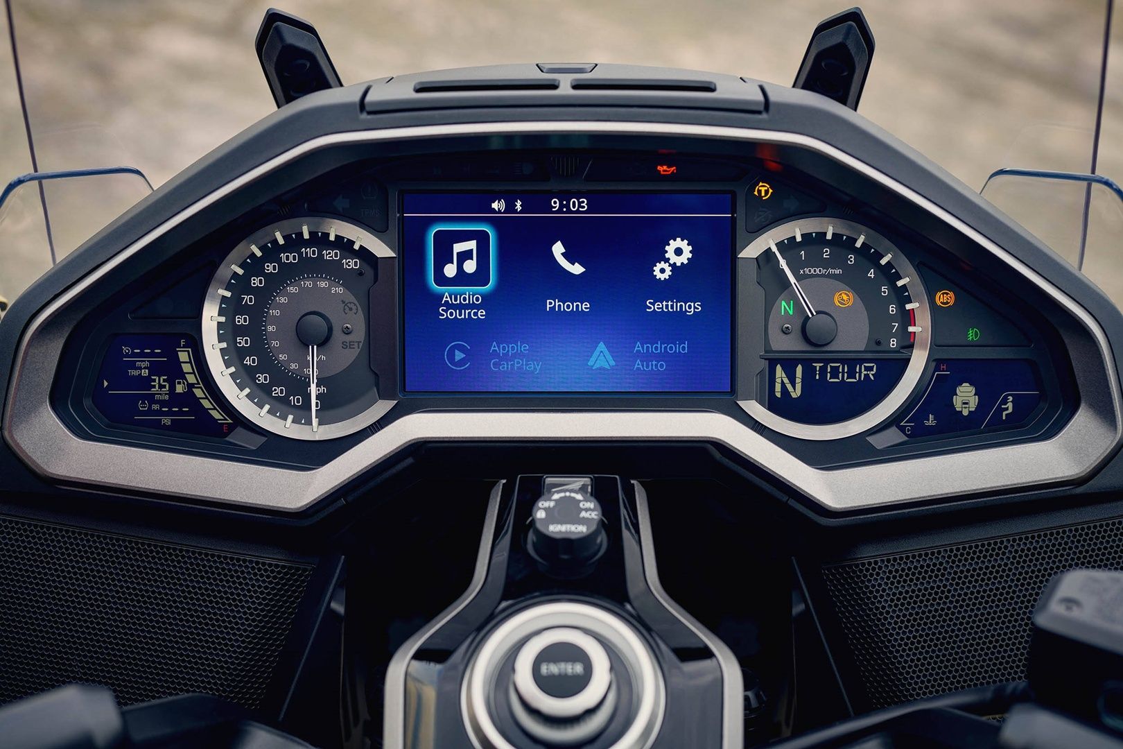 Luksusowe instrumentarium tworzy unikatowy kokpit motocykla. Dla tarcz wskaźników zegarowych wybrano różne kolory o niskim kontraście z ciemnymi odcieniami, z zewnętrznymi częściami tarcz uformowanymi stożkowo, by wytworzyć poczucie głębi. Pierścień z metalową teksturą otacza każdą z tarcz, a podziałki podświetlone diodami LED wzmacniają głębię i tworzą spokojną, ale efektowną grafikę.