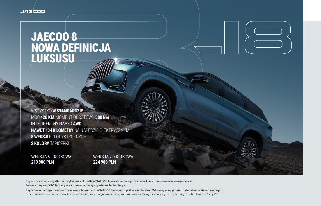 Cennik flagowego modelu JAECOO 8 Super Hybrid przewiduje wyłącznie jedną wersję wyposażenia – Premium. W przypadku wersji 5-osobowej pojazd został wyceniony na 219 900 złotych, natomiast w przypadku wariantu 7-osobowego obowiązuje cena wynosząca 224 900 złotych. Wybór liczby miejsc jest zatem jedyną opcją wymagającą dopłaty. Oznacza to, że klienci będą mogli dowolnie wybierać opcje kolorystyki nadwozia.