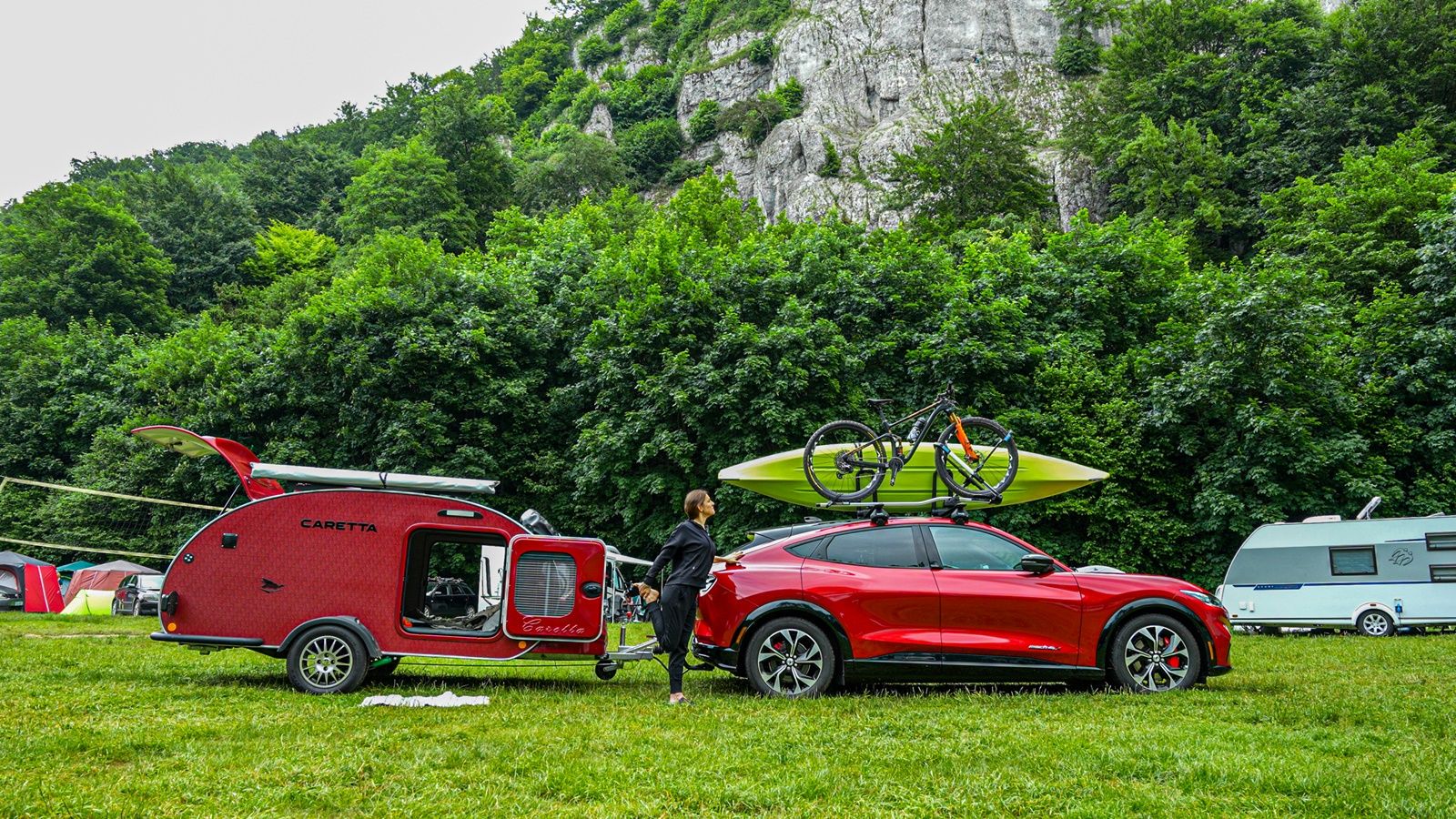 Ford Mustang Mach-E zgodnie z homologacją może transportować na swoim dachu bagaż o wadze 75 kg. W wersji z dachem panoramicznym limit ten wynosi 65 kg. Oznacza to, że bez problemu można nim przewieźć kajak, rower, boks dachowy czy narty. Dodatkowo dopuszczalna masa holowanej przez Macha-E przyczepy z hamulcem wynosi do 1500 kilogramów.
