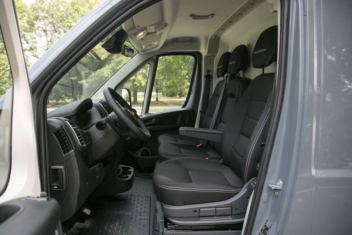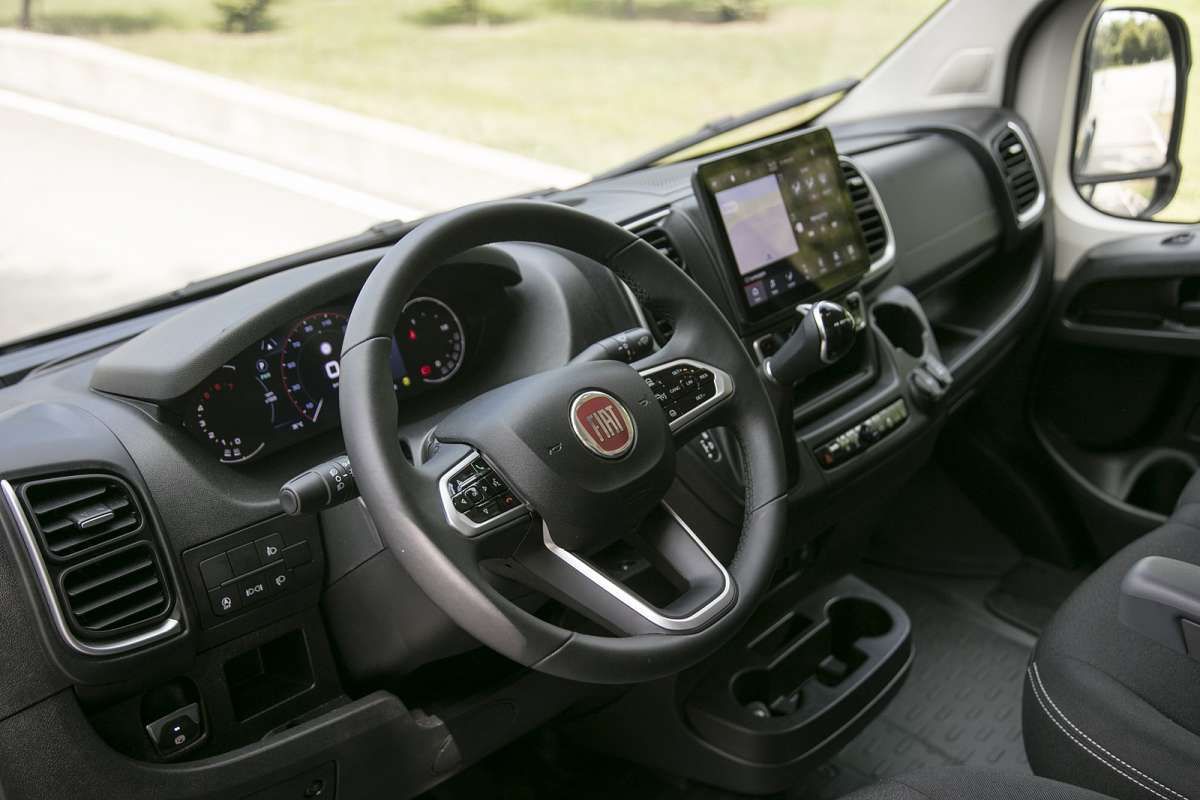 We wnętrzu samochodu należy podkreślić, że w kabinie trwa prawdziwa „rewolucja”, mająca na celu poprawę jakości i komfortu jazdy, dzięki zastosowaniu praktycznych rozwiązań, takich jak: funkcja „Keyless Entry and Go”, umożliwiająca otwieranie i zamykanie drzwi samochodu i przestrzeni ładunkowej oraz uruchamianie silnika bez użycia kluczyka; elektryczny hamulec postojowy pozwalający usunąć z kabiny masywne elementy, fotel pasażera typu „Eat and Work”, który po złożeniu staje się wygodną przestrzenią do pracy lub spożywania przekąsek; tacka do bezprzewodowego ładowania smartfonów, a także podwójne wejścia USB typu A i C, gniazdo 230 V; podgrzewana przednia szyba z wewnętrznymi grzałkami elektrycznymi do szybkiego odszraniania. Odświeżone wnętrze wzbogacone jest o przeprojektowaną deskę rozdzielczą, nową kierownicę, gałkę dźwigni zmiany biegów, nowe panele drzwiowe oraz nowy panel sterowania automatyczną klimatyzacją. Fotele o bardziej nowoczesnym wyglądzie z poprawionym wypełnieniem oferują więcej przestrzeni i komfortu, a nowe elektryczne wspomaganie kierownicy, będące standardem w całej gamie, pozwala na bardziej precyzyjne prowadzenie samochodu w każdych warunkach jazdy i obciążenia. To w połączeniu z kierownicą o zmniejszonym rozmiarze na nowo definiuje pojęcie komfortu w nowej kabinie Ducato, z korzyścią dla ergonomii i zmniejszenia stresu kierowców i pasażerów przy wytężonej pracy.