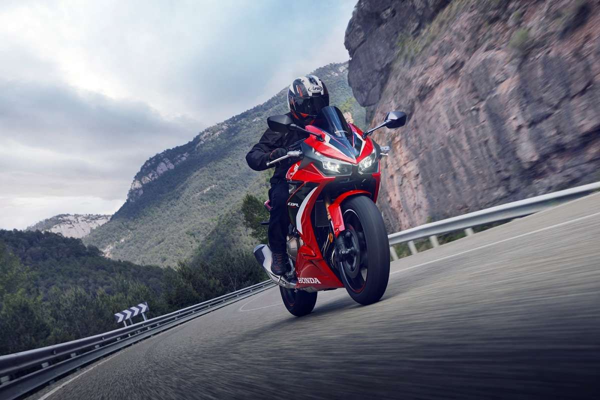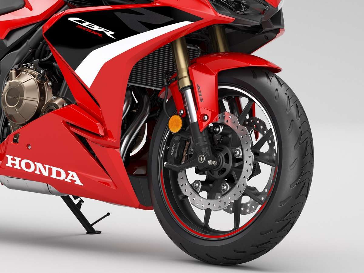 Niezmieniona w modelu 2022 rama główna ze stalowych rurek o średnicy 35 mm jest lekka i mocna, z dobrze dostrojoną sprężystością, dającą wiele informacji zwrotnych kierowcy przy zmianie nawierzchni. Kształt i położenie wsporników silnika, a także zrównoważona sztywność ramy minimalizuje też przenoszone na nią drgania. Nowe zawieszenie przedniego koła rzuca się w oczy od pierwszej chwili. Dla podwyższenia osiągów przy sportowym stylu jazdy, teleskopowy widelec 41 mm poprzedniej konstrukcji został zastąpiony przez widelec USD Showa Separate Function Fork Big Piston (SFF-BP) 41 mm, prowadzony przez nowe półki górną i dolną. Dzięki rozdzieleniu funkcji, amortyzator Big Piston, znajdujący się w jednej goleni, i mechanizm sprężynowy w drugiej, poprawiają zarówno reakcje motocykla, jak i jakość jazdy. W czterocylindrowej Hondzie CBR650R zastosowano dokładnie taki sam układ. W ramach dalszych działań, zmierzających do poprawy jakości jazdy, model CBR500R 2022 wyposażono w nowe, lżejsze koła z 5 ramionami w kształcie litery Y, zamiast 6 ramion, jak w poprzednim modelu. Przednia obręcz ma nadal szerokość 3,5 cala i funkcjonuje w parze z oponą 120/70-ZR17. Na tylną obręcz 4,5 cala zakładana jest opona 160/60-ZR17. Przeprojektowany wahacz również zrzucił kilka gramów i jest teraz zbudowany ze stali o grubości 2 mm (zamiast 2,3 mm), dodatkowo posiada wydrążoną poprzeczkę oraz wyraźnie przeprojektowaną osłonę łańcucha. Sztywniejszy skrętnie nowy wahacz jest również bardziej elastyczny poprzecznie, co poprawia prowadzenie. Jednorurowy amortyzator tylny (jak w przypadku maszyn sportowych o większej pojemności), z tłokiem o dużej średnicy, zapewnia doskonałą reakcję zawieszenia i kontrolę temperatury, ma 5-stopniową regulację napięcia wstępnego oraz ustawienia sprężyny i tłumienia dobrane pod kątem charakterystyki przedniego widelca. Wraz z poprawą dynamiki podwozia i zawieszenia poprawiono również skuteczność hamowania. Pojedynczy hamulec przedni o średnicy 320 mm z dwutłoczkowym zaciskiem z poprzedniego modelu został zastąpiony podwójnymi tarczami o średnicy 296 mm i dwutłoczkowymi zaciskami Nissin montowanymi radialnie. Wprowadzenie mniejszych tarcz nie tylko minimalizuje przyrost masy, ale także zmniejsza wymagany nacisk na dźwignię podczas hamowania. Masa własna nowej Hondy CBR500R pozostaje na poziomie 192 kg, ale w porównaniu z poprzednim modelem, większa część ciężaru spoczywa na przednim kole, co pozwoliło uzyskać bardziej zwinne prowadzenie i poprawić przyczepność przodu motocykla. Procentowy rozkład masy na przód i tył wynosi teraz 50,7/49,3, w porównaniu do wcześniejszego 50,1/49,9. Rozstaw osi wynosi 1410 mm, z pochyleniem główki ramy 25,5° i wyprzedzeniem 102 mm. Właśnie dynamiczne reakcje są cechą charakterystyczną CBR500R. Widok zza kierownicy jest typowy dla motocykla sportowego. Kierownica typu clip-on została umieszczona pod górną półką, dzięki czemu prowadzący jest pochylony do przodu. Przednia owiewka jest również ustawiona nisko. Aluminiowe podnóżki o wyrazistym wyglądzie, zastępujące poprzednie, pokryte gumą elementy, pozwoliły zaoszczędzić kolejne 104 g, zapewniając wystarczające podparcie podczas bardziej dynamicznej jazdy. Kompaktowy przedni błotnik został przejęty bezpośrednio z modelu CBR650R. Nowy, drapieżnie ukształtowany podwójny reflektor LED, odziedziczony po CBR650R, groźnie wpatruje się przed siebie, emitując szerszy strumień światła. Towarzyszą mu diodowe kierunkowskazy. Zestaw wskaźników LCD informuje o aktualnie załączonym biegu i wyświetla sugestie zmienienia go na wyższy. Wskaźnik zmiany biegu jest ustawiony na domyślną wartość 8750 obrotów na minutę, ale punkt ten można regulować w krokach co 250 obr./min. w zakresie 5000-8750 obr./min. Pozostawiono niską pozycję siedzenia na poziomie 785 mm, dzięki czemu CBR500R jest bardzo łatwy do opanowania, a pozycja kierowcy zapewnia wygodną jazdę niezależnie od jego wzrostu. Ogólne wymiary to 2080 mm x 760 mm x 1145 mm, z prześwitem 130 mm. Zbiornik paliwa mieści 17,1 litra benzyny łącznie z rezerwą, co dzięki wyjątkowo niskiemu zużyciu paliwa 3,5 l/100 km, zapewnia zasięg rzędu 485 km.