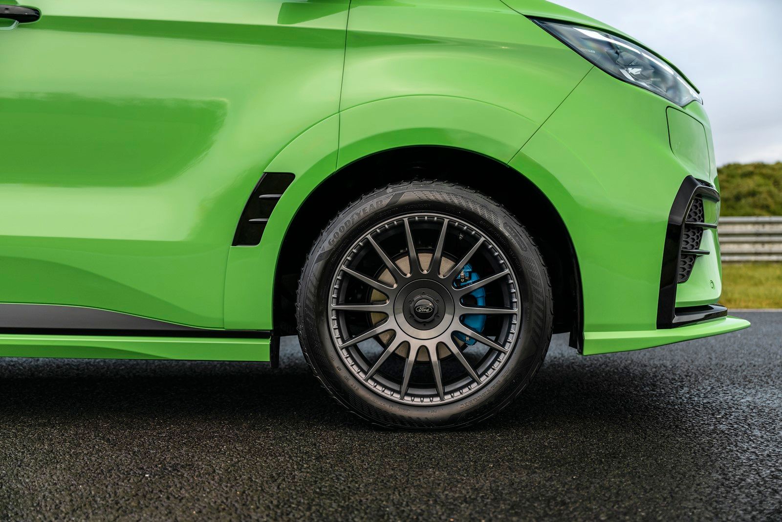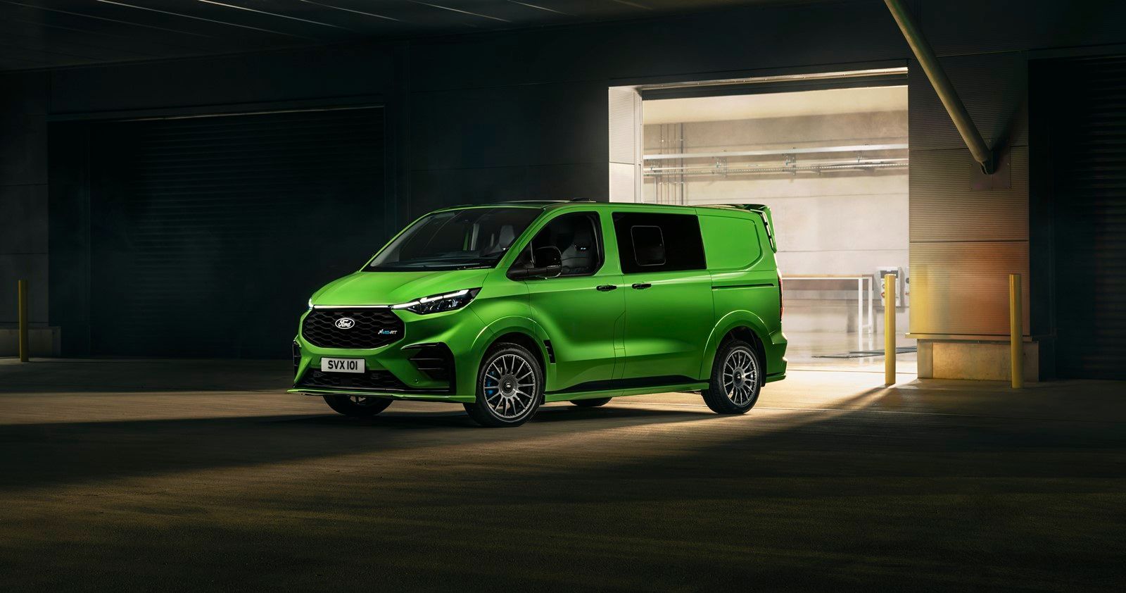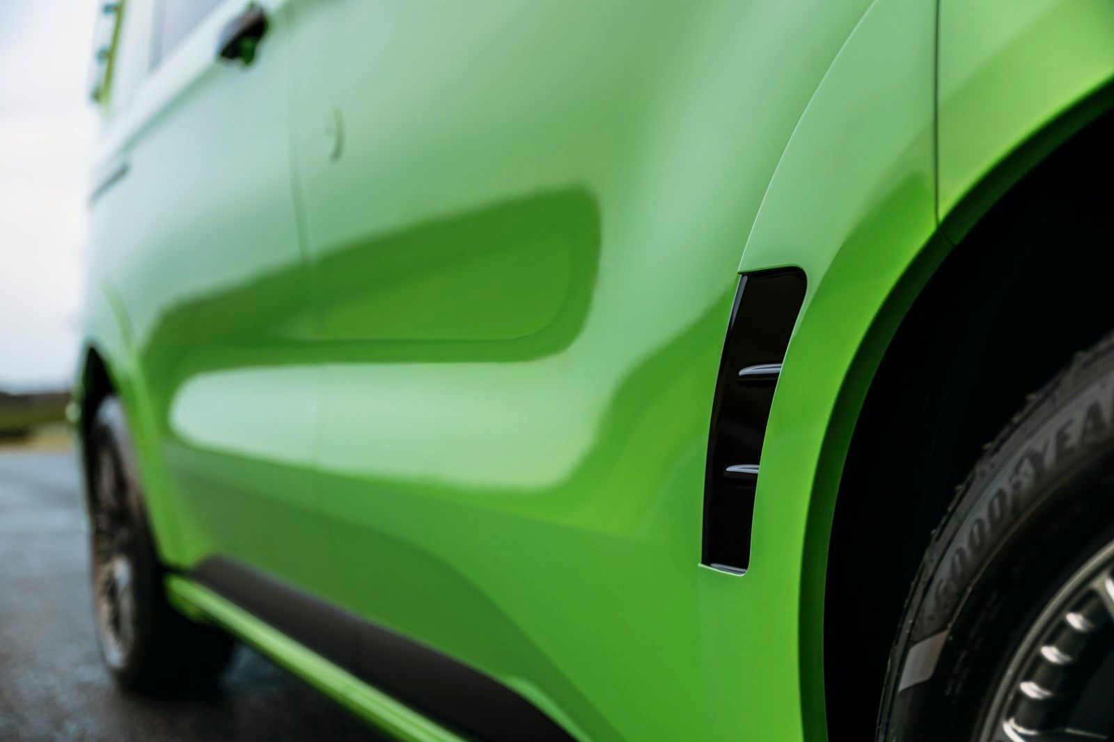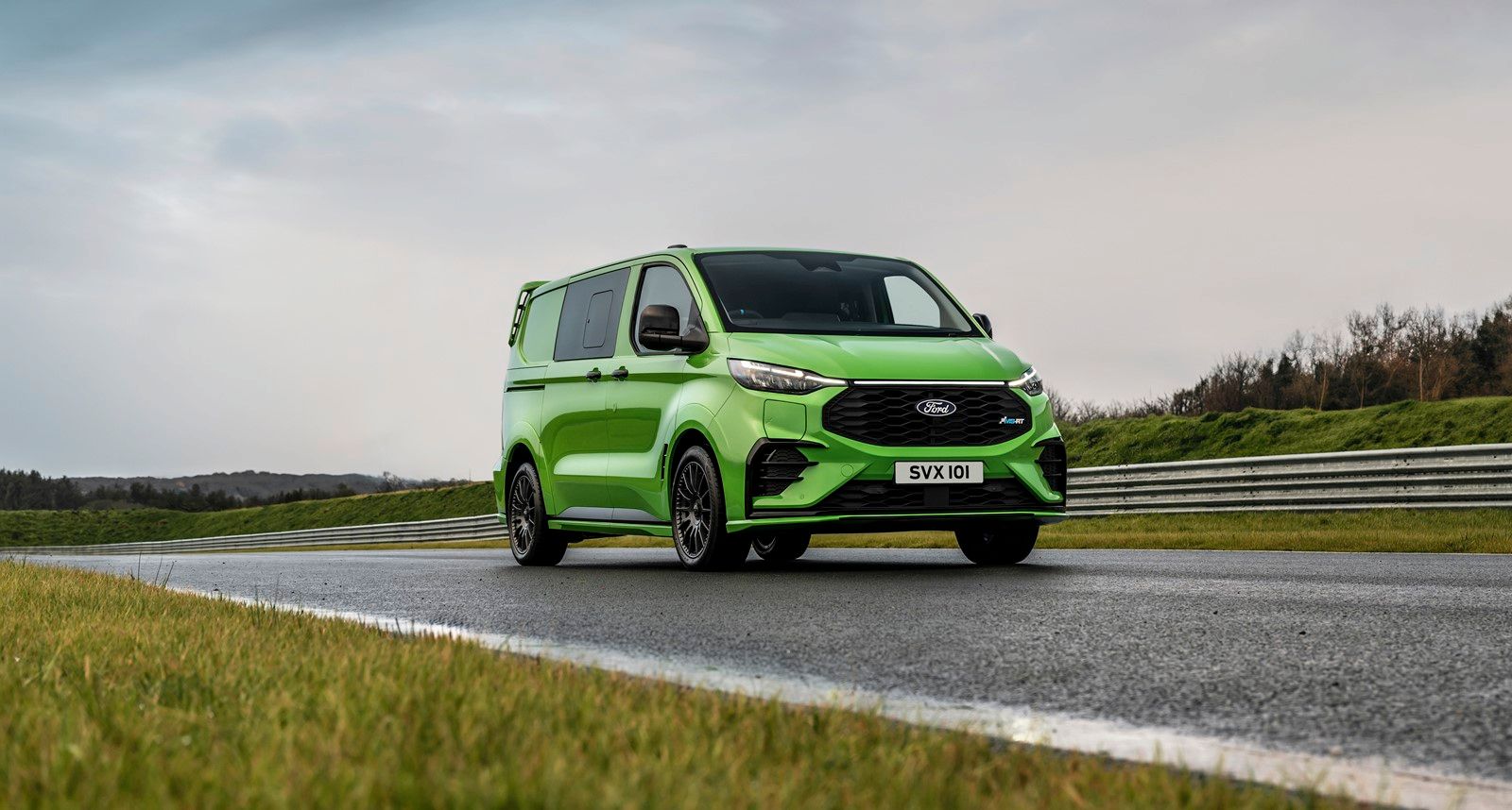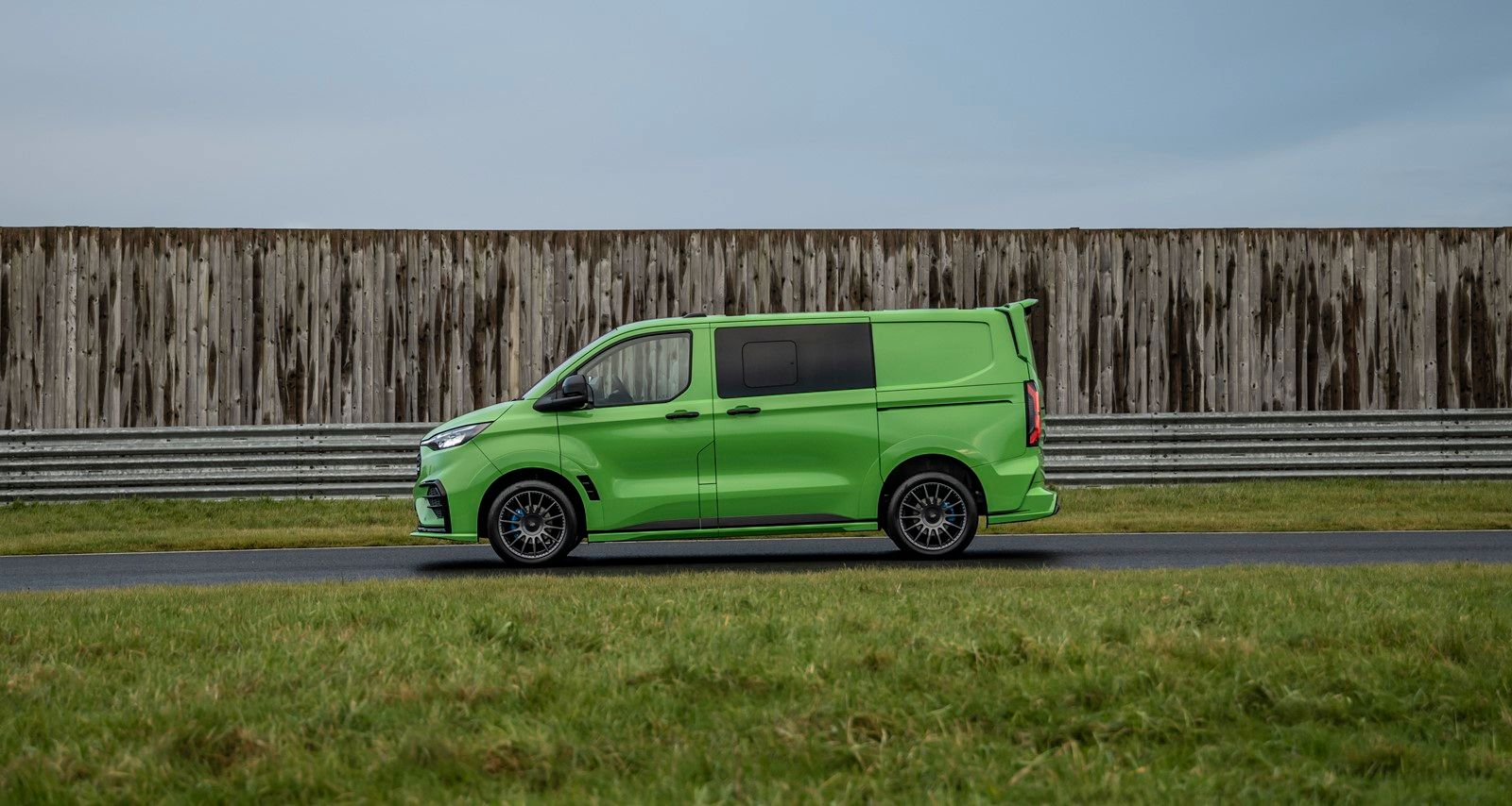 Pod szerszymi nadkolami zamontowano stworzone dla tego modelu antracytowe 19-calowe felgi aluminiowe, o pół cala szersze niż felgi Transita Custom w wersji Sport. Zmniejszają one masę nieresorowaną o nieco ponad 1 kg, a jednocześnie zwiększają rozstaw kół o ponad 50 mm w porównaniu ze standardowym Customem. Opony Goodyear Eagle Sport 235/45 R19 i nowa platforma Transita Custom z niezależnym tylnym zawieszeniem poprawiają nie tylko stabilność na drodze, ale także komfort podróżowania.