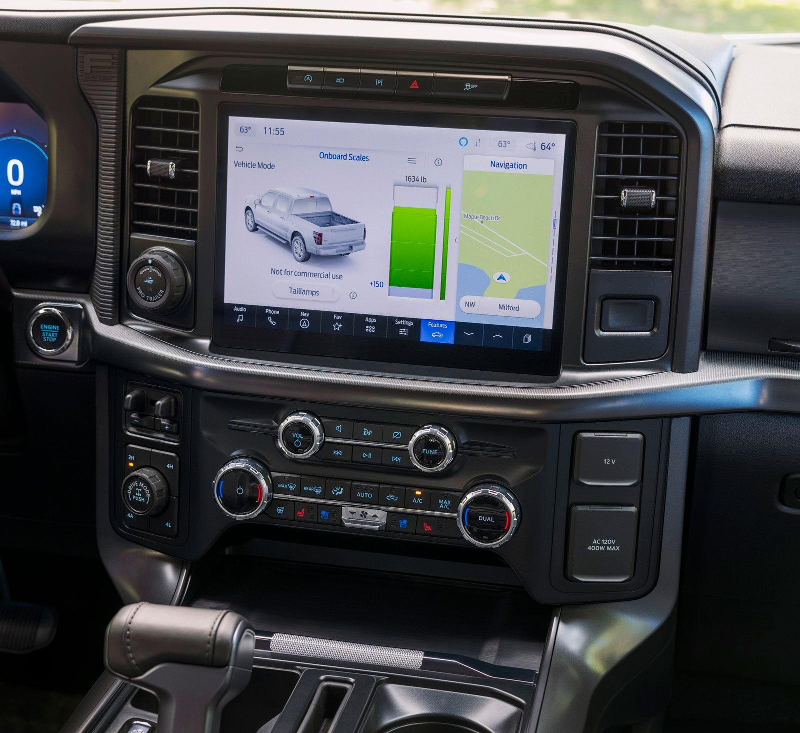 SYNC 4 z 12-calowym pojemnościowym ekranem dotykowym LCD jest teraz standardem w całej gamie i uzupełnia standardowy 12-calowy ekran zespołu wskaźników, dostarczając kierowcy jeszcze więcej przydatnych informacji. 12-calowy ekran zestawu wskaźników zawiera grafiki i animacje specyficzne dla F‑150, które odpowiadają wybranym trybom jazdy i mogą wyświetlać dane terenowe oraz nawigacyjne zakręt po zakręcie. Nowością na rok modelowy 2024 w F‑150® Raptor® i F‑150 jest możliwość wyświetlania dwóch widoków jednocześnie w trybach holowania, jazdy terenowej i trybie pełzania po skałach. Jeszcze łatwiejszą metodą dostarczania informacji jest dostępny po raz pierwszy w modelu F‑150 wyświetlacz przezierny (Head-Up)*.