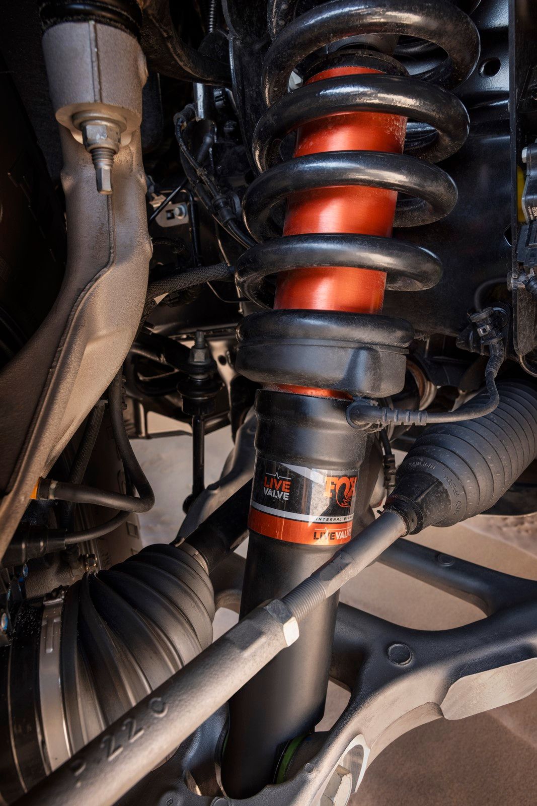 F‑150 Raptora na rok 2024 wyposażono w nowe amortyzatory FOX Dual Live Valve, które zapewniają pewniejszą i lepiej kontrolowaną jazdę. Nowe – dostępne w standardzie – bezstopniowe sterowanie odbiciem z zależną od pozycji amortyzatora kontrolą ciśnienia poprawia obecnie zarówno jakość jazdy w terenie, jak i na szosie, dzięki technologii Dual Live Valve. Podobnie jak amortyzatory Live Valve, nadal dostępne w niektórych konfiguracjach F‑150 Raptor, amortyzatory Dual Live Valve są sterowane przez zaawansowane algorytmy terenowe, zaprojektowane przez Ford Performance i używane wyłącznie przez Forda. Pięciowahaczowe tylne zawieszenie wyposażono w wyjątkowo długie wahacze wleczone, które lepiej utrzymują pozycję osi w trudnym terenie, zastosowano też drążek Panharda i 24-calowe sprężyny śrubowe, a wszystko to zoptymalizowane pod kątem wyjątkowej stabilności podczas agresywnego przemierzania pustynnego terenu. Nowy modułowy przedni zderzak odsłania standardowe kute zaczepy holownicze. Oferują solidne punkty mocowania – przydatne, gdy trzeba ratować z opresji inne pojazdy podczas wypraw terenowych.