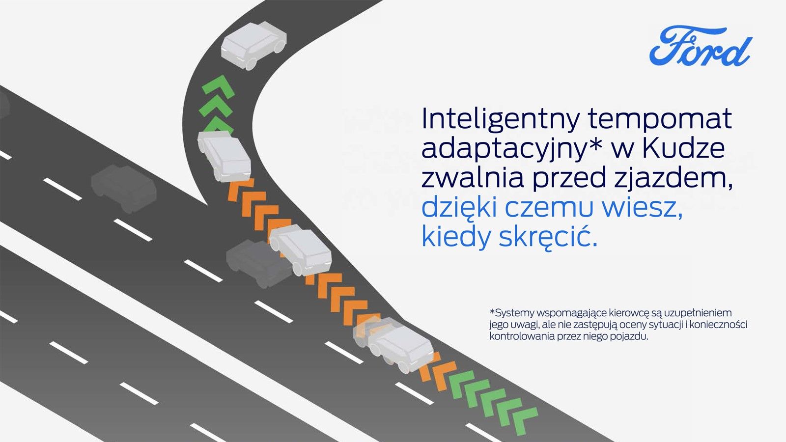 Nowy Ford Kuga  jest jednym z modeli wyposażonych w inteligentny tempomat adaptacyjny, który może sprawić, że takie przegapione zakręty przestaną być problemem kierowców. Skomunikowana nawigacja połączona z chmurą  współpracuje z tempomatem adaptacyjnym, zmniejszając prędkość samochodu podczas zbliżania się do wybranego zjazdu z autostrady, ponadto samochód poinformuje o tym za pośrednictwem alertów wizualnych i dźwiękowych.