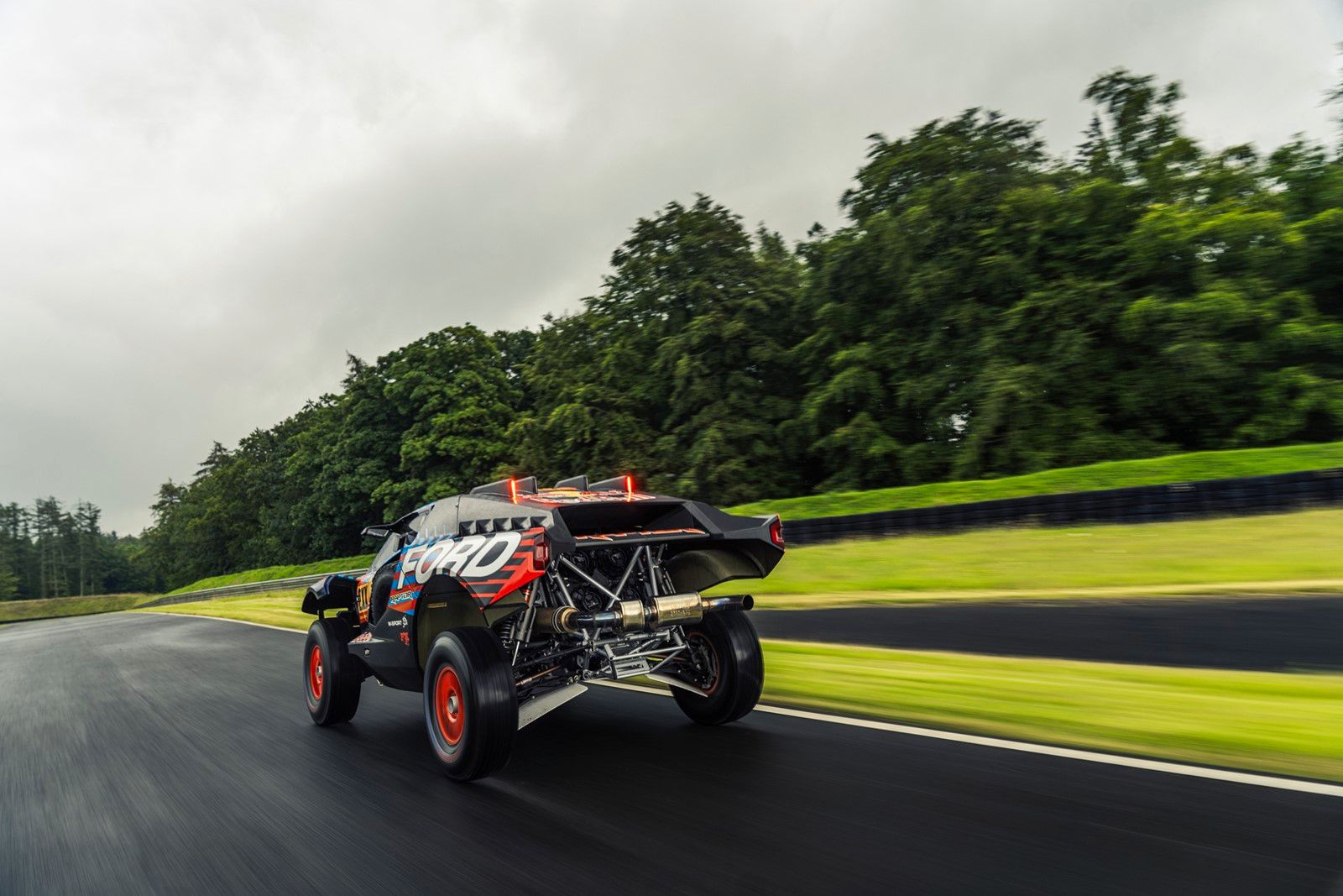 ▪ Specjalnie zaprojektowana terenowa struktura: samochód zbudowany na ramie przestrzennej ze stali T45 i paneli poszycia nadwozia z włókna węglowego, łączy funkcjonalność z charakterystyczną dla Forda Raptora estetyką – prześwit 400 mm, szeroka sylwetka zapewniająca lepszą stabilność w terenie i wymodelowana krata chłodnicy z napisem FORD sprawiają, że samochód nie tylko wygląda atrakcyjnie, ale zyskał walory wyczynowe. Minimalna masa Forda Raptora T1+ wynosi 2010 kg, szerokość 2300 mm, a kąt natarcia przekracza 70°.