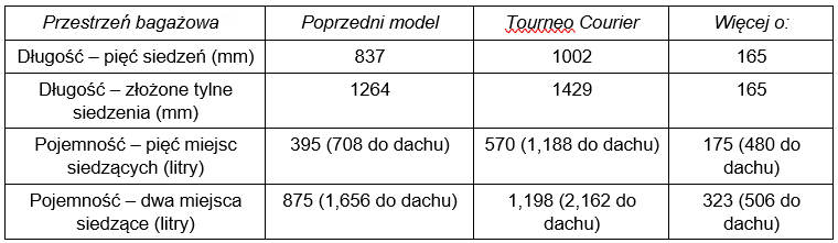 Optymalizacja kształtu nadwozia oznacza, że wnętrze Tourneo Courier jest znacznie przestronniejsze i praktyczniejsze niż kabina poprzedniego modelu. Wzrosła przestrzeń zarówno dla pasażerów, jak i bagażu.  Dzięki ponad 44% większej przestrzeni bagażowej można podróżować bez martwienia się o rozmiary bagażu. Duża tylna klapa chroni przed deszczem, gdy rodzina pakuje bagażnik lub zakłada kalosze, a opcjonalny alarm z czujnikami objętościowymi zapewnia ochronę zarówno samego Tourneo Couriera, jak i jego zawartości.