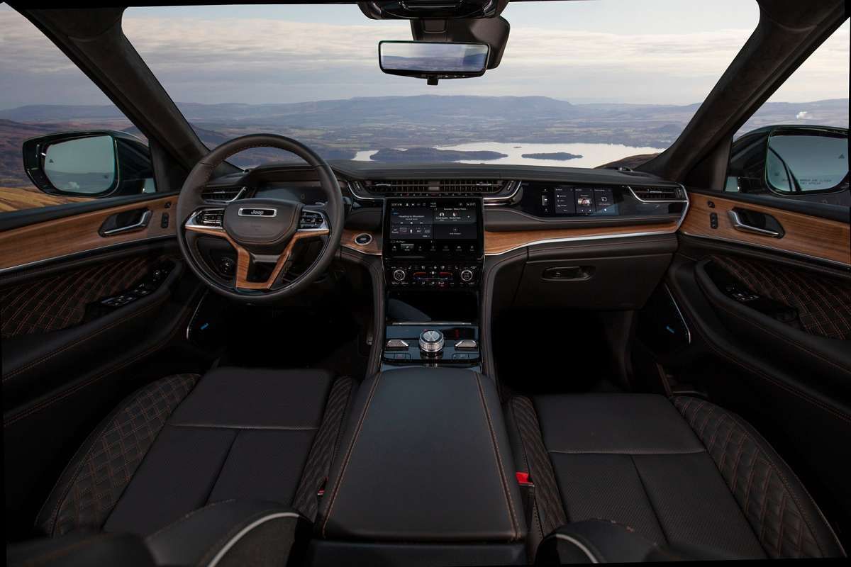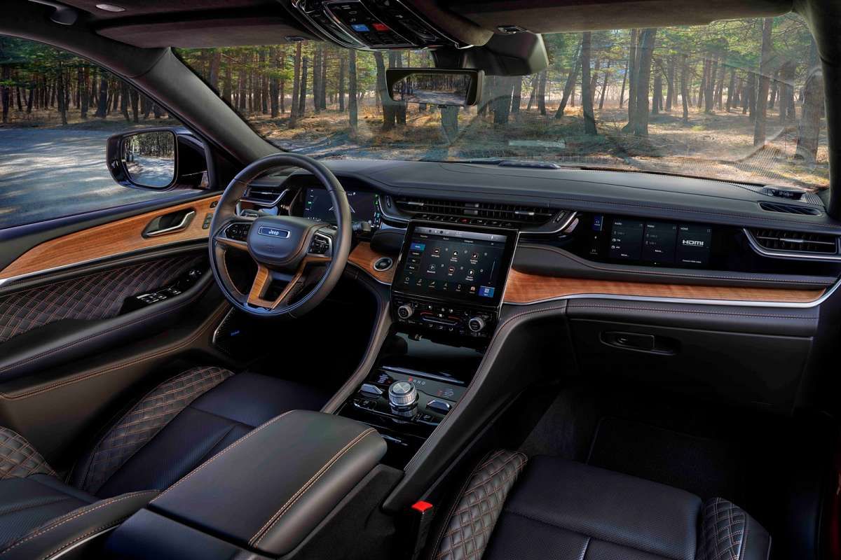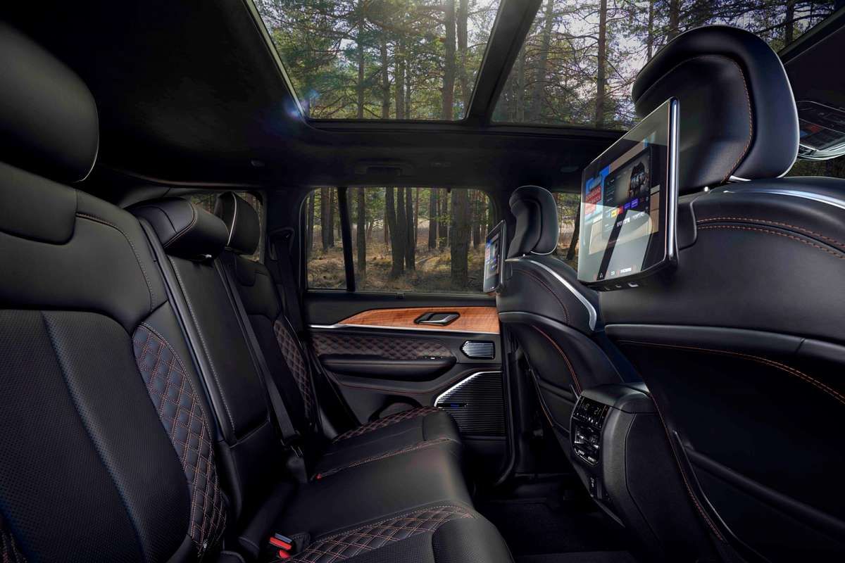 Luksusowe wnętrze najnowszego Jeepa Grand Cherokee 4xe kolejnej generacji zostało wzbogacone o ręcznie wykonane elementy i nowoczesne udogodnienia. W panelu przednim znajdują się nowe, wąskie otwory wentylacyjne HVAC, przeprojektowana konsola centralna, która teraz jest bardziej wygodna i ergonomiczna oraz 25,7 cm (10,1-calowy) ekrany cyfrowe (cyfrowy zestaw wskaźników i ekran dotykowy systemu multimedialnego), a także pierwszy w segmencie interaktywny ekran pasażera z przodu o przekątnej 26 cm (10,25-calowy). Zupełnie nowa architektura siedzeń Jeepa® oferuje regulację długości siedziska foteli przedniego rzędu. Fotele w pierwszym rzędzie z elektryczną regulacją w 16 pozycjach i pamięcią ustawień oferują podparcie odcinka lędźwiowego, a wersje o wyższej specyfikacji oferują oparcia foteli kierowcy i pasażera z funkcją masażu. W dwóch pierwszych rzędach dostępne są podgrzewane/wentylowane fotele z możliwością ustawienia trzech poziomów intensywności. Konsola środkowa ma teraz unowocześnione przełączniki, więcej miejsca w przednim schowku, który może pomieścić dwa urządzenia bezprzewodowe oraz ładowarkę bezprzewodową. Nowy Jeep Grand Cherokee 4xe jest standardowo wyposażony w pełen zestaw całkowicie nowego, personalizowanego oświetlenia wewnętrznego LED, z ustawieniami dziennymi/nocnymi, a w modelach Overland i Summit Reserve dostępne jest prawdziwe ambientowe oświetlenie z wyborem pięciu kolorów.