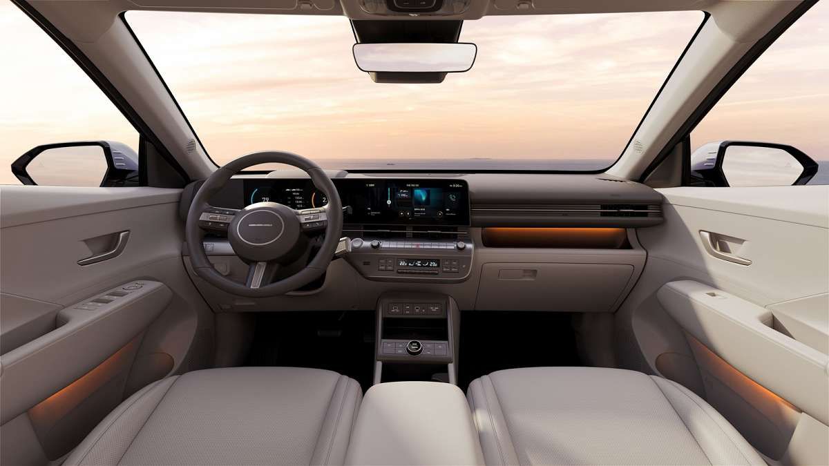 Całkowicie nowa KONA zapewnia przestronniejsze, bardziej wszechstronne wnętrze, zwiększające komfort pasażerów i ułatwia przewożenie ładunków. Oferuje również najlepszą w swojej klasie przestrzeń dzięki większemu o 60 mm rozstawowi osi, większej o 77 mm przestrzeni na nogi i większej o 11 mm przestrzeni nad głowami w drugim rzędzie siedzeń w porównaniu z poprzednią generacją. Przestrzeń na wysokości ramion w drugim rzędzie wynosi 1402 mm i jest również największa w swojej klasie, zapewniając pasażerom najlepszej klasy „przestrzeń życiową”. Smukłe i sztywne siedzenia modelu KONA, które mają tylko 85 mm grubości, zapewniają również więcej przestrzeni pasażerom drugiego rzędu siedzeń. Ponadto selektor zmiany biegów umieszczony przy kierownicy zapewnia miejsce na otwartą, przejrzystą konstrukcję konsoli środkowej, która zapewnia więcej miejsca na rzeczy i schludny wygląd wnętrza. W pełni składane siedzenia w drugim rzędzie i większy bagażnik, sprostają najwyższym wymaganiom Klientów i poprawią wygodę załadunku. Dwa zintegrowane wyświetlacze o przekątnej 12,3 cala zapewniają ergonomiczną i wygodną obsługę, a opcjonalne komfortowe fotele w pierwszym rzędzie są zoptymalizowane pod kątem rozkładu nacisku na ciało. Zapewniają stan bliski „nieważkości”, aby złagodzić zmęczenie po długich podróżach.