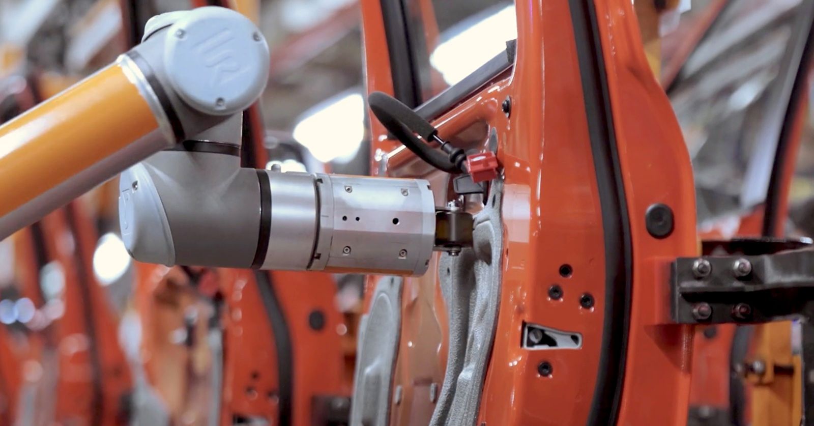 Coboty UR10e o zasięgu jednego metra są rozmieszczone wzdłuż linii montażowej drzwi. Czujnik wykrywa ruch taśmy i zbliżanie się drzwi oraz ich idealne, co do milimetra, ustawienie w punkcie montażu. Synchronizacja ta zapewnia precyzję ścieżki, jaką pokonuje ramię cobota podczas montażu paneli zewnętrznych odpornych na niekorzystne warunki atmosferyczne.