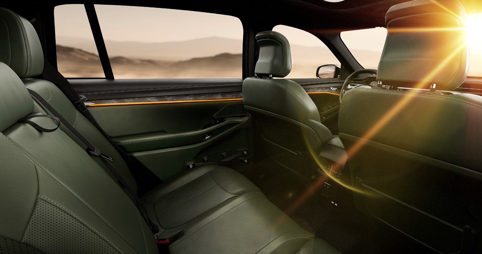 Fotele przednie o agresywnym profilu zachowują równowagę między sportowymi i luksusowymi elementami wyposażenia, która charakteryzuje seryjnie produkowanego Jeepa Wagoneera S. Podgrzewane i wentylowane fotele są pokryte tapicerką w kolorze Mantis Green z ekskluzywnym perforowanym wzorem w jodełkę. Na tapicerce znajdują się przeszycia z wstawkami w kolorze Ultraviolet oraz ozdobne wykończenia z tkaniny.