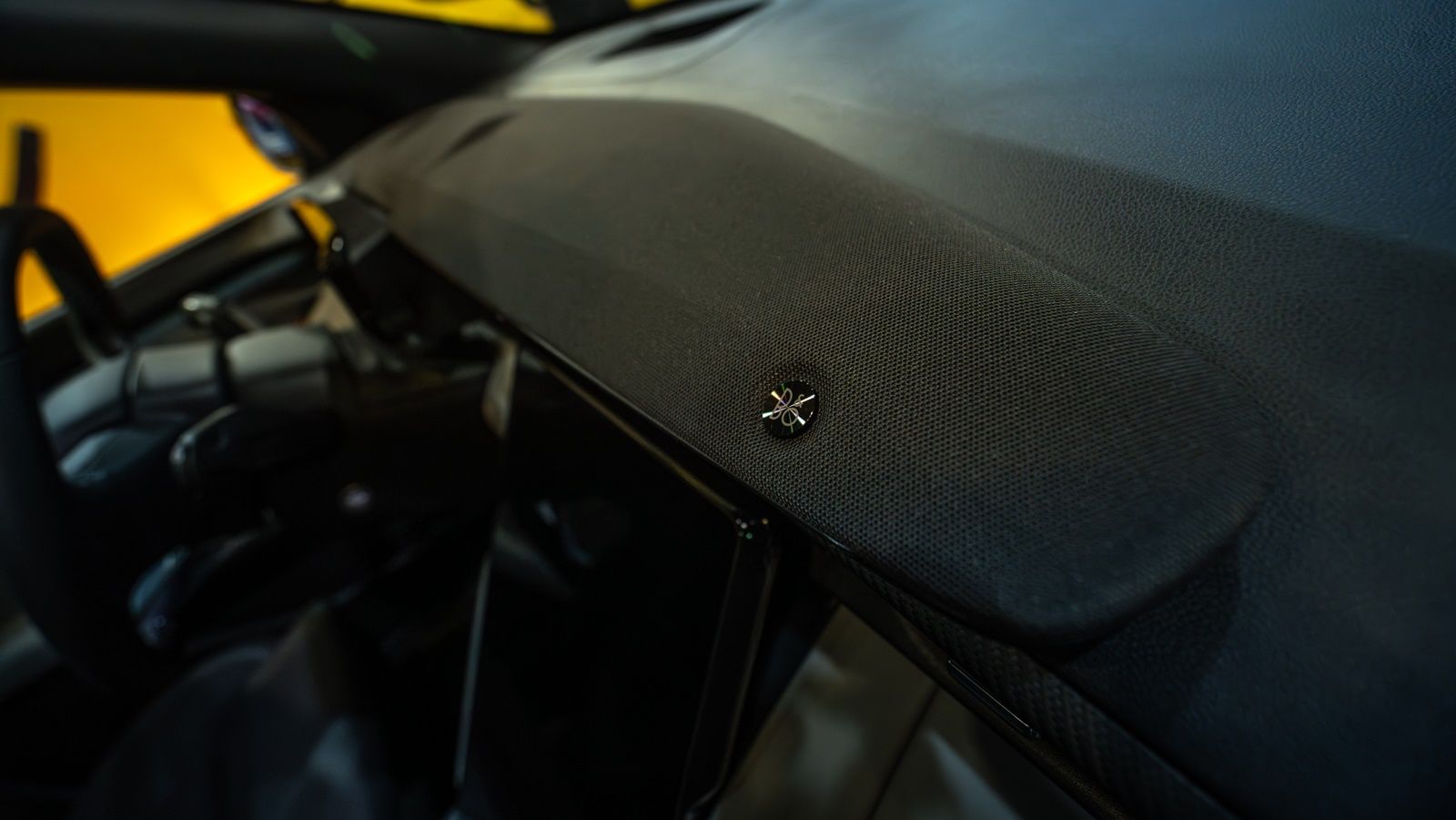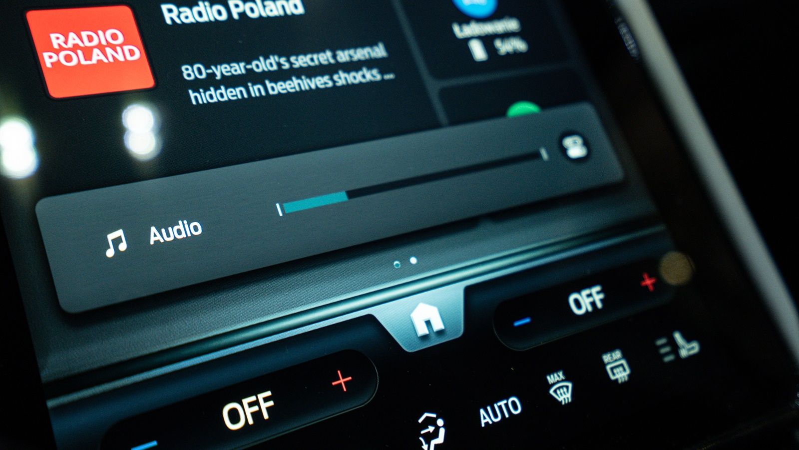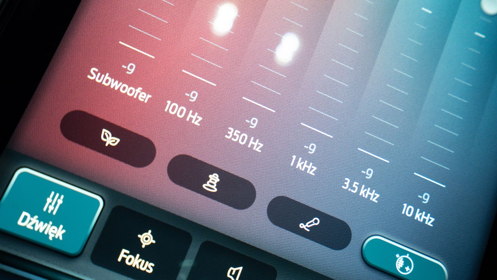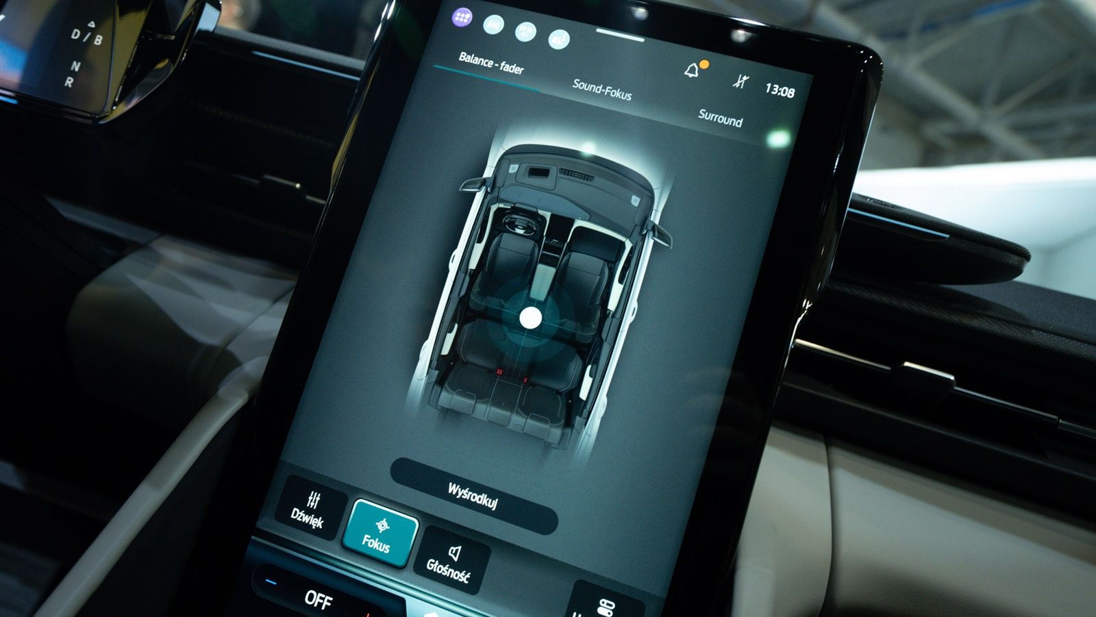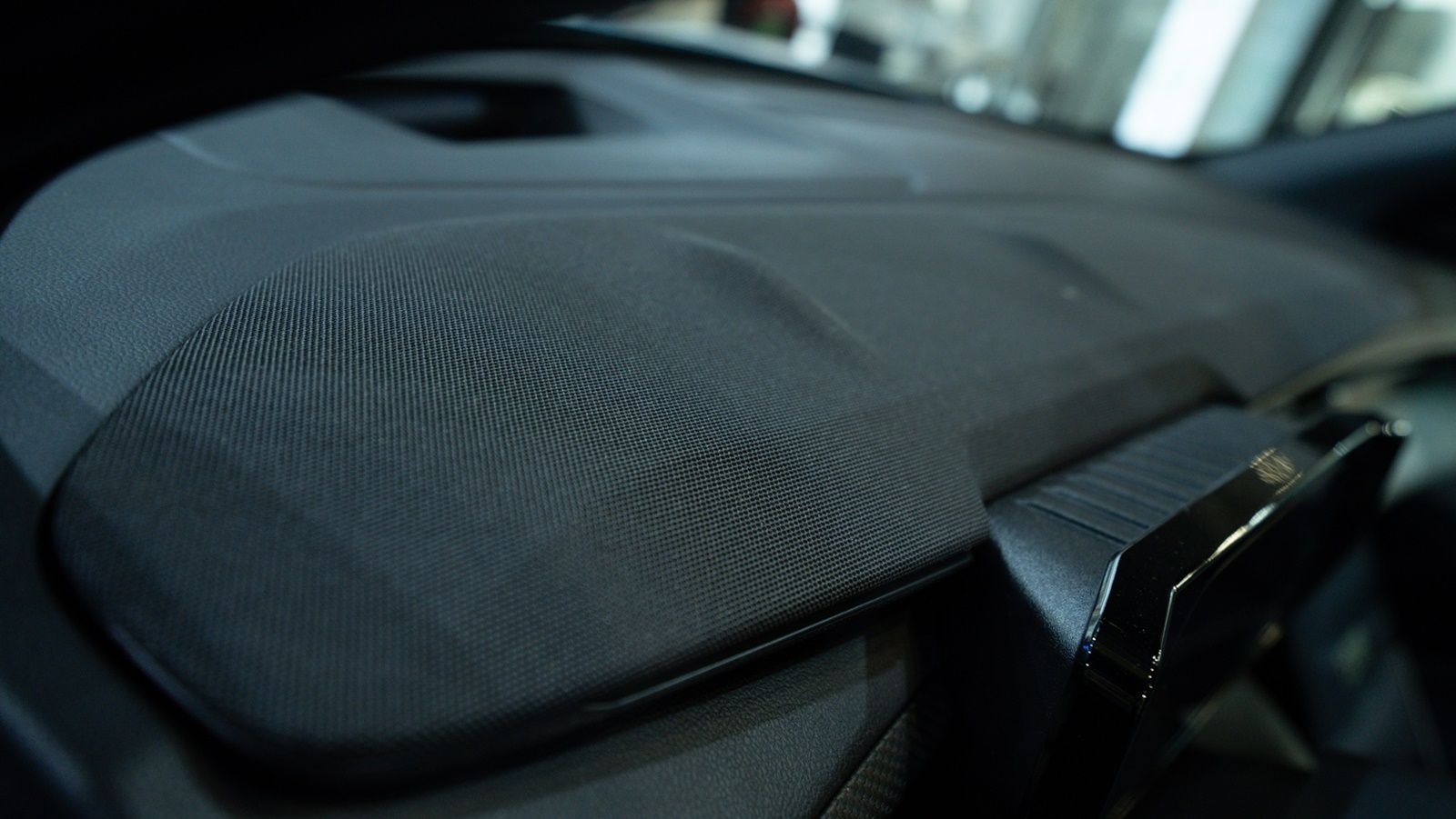 ► Głośnik centralny, wbudowany w soundbar, zapewnia równomierne rozprowadzenie dźwięku po całej kabinie, aby każdy pasażer mógł cieszyć się perfekcyjnym brzmieniem niezależnie od miejsca;